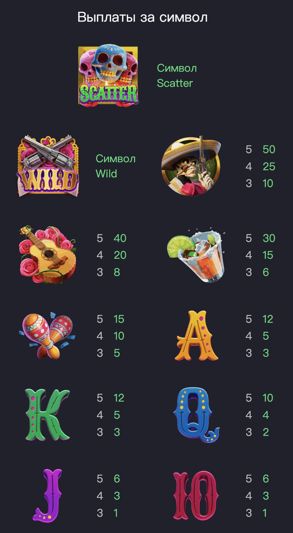 - Símbolos de alto pagamento: Maracas, Tequila, Guitarra e Sistema Esquelético com uma Arma